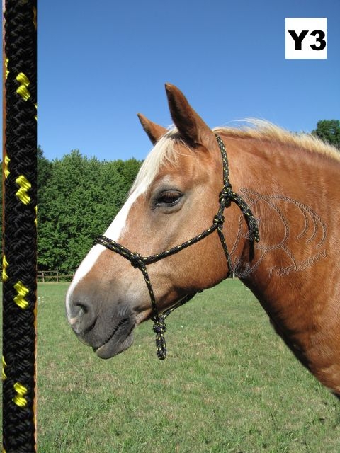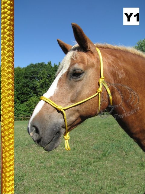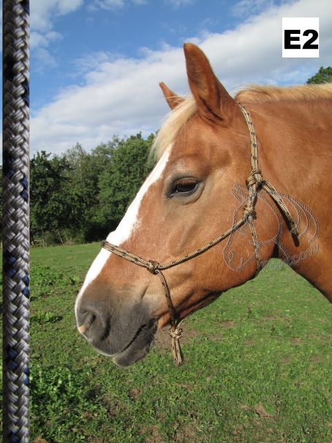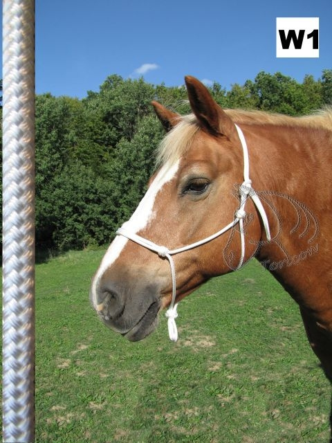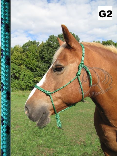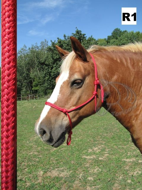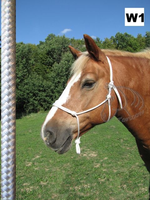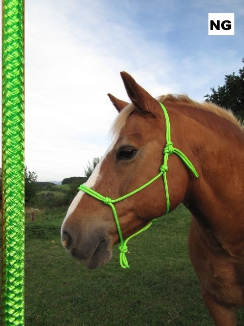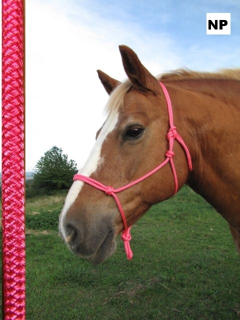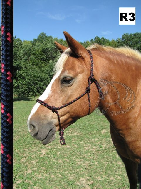 Klasická provazová ohlávka. Těžká šňůra, měkká a příjemná na dotek, ale přitom pod opakovyným zatěžováním NEPRŮTAŽNÁ, po dobu používání neměnící zásadním způsobem své vlastnosti.