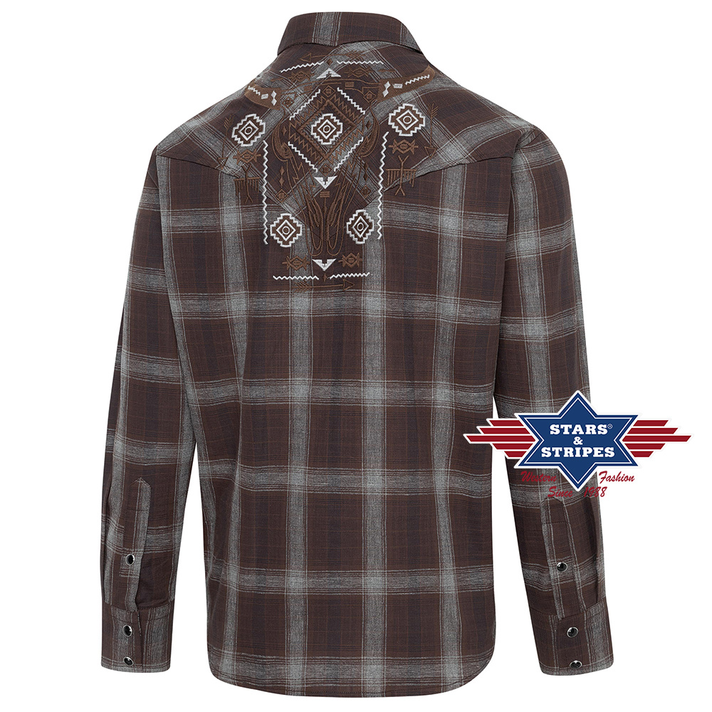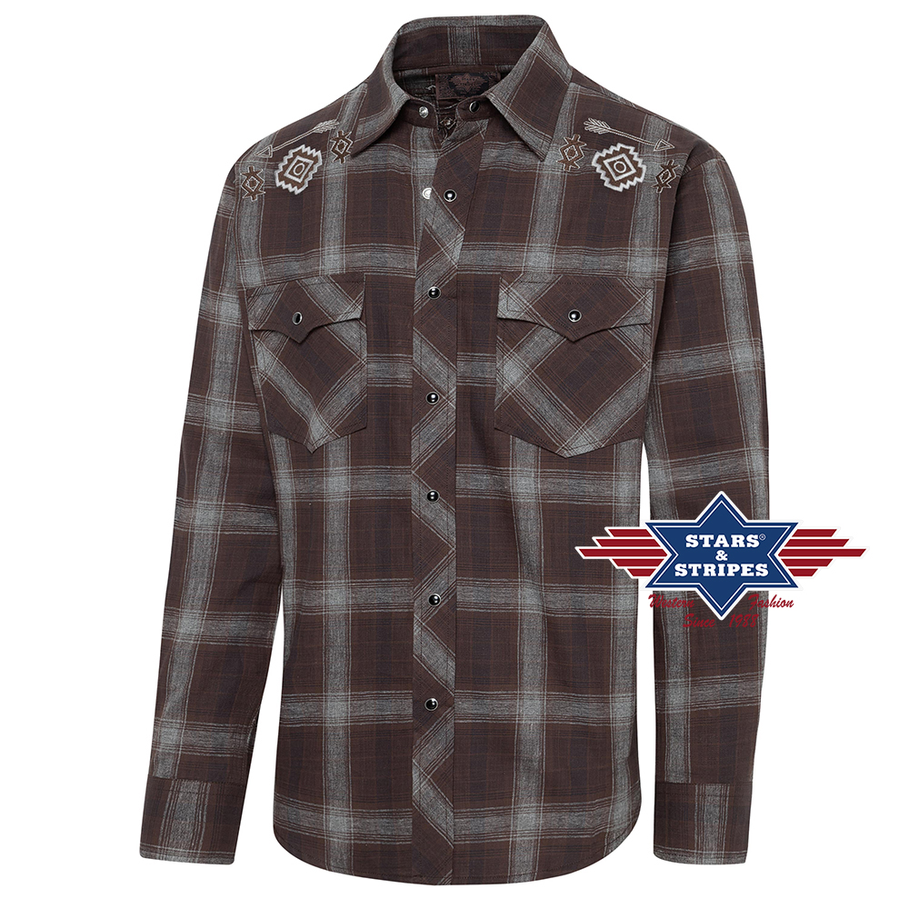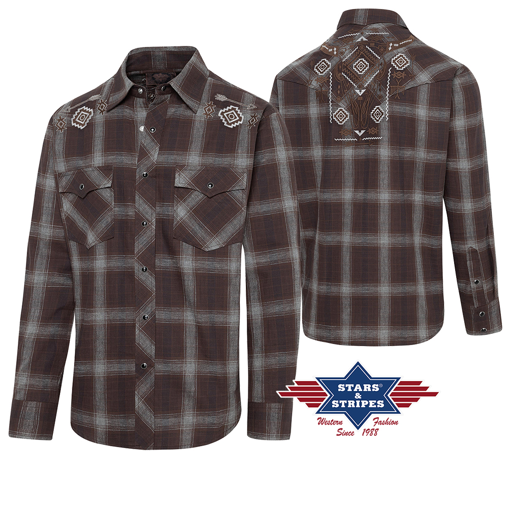 Stylová karovaná westernová košile s aztéckými výšivkami vepředu i vzadu. Náprsní kapsy, westernové sedlo a elegantní druky uhranou každého milovníka westernové módy.