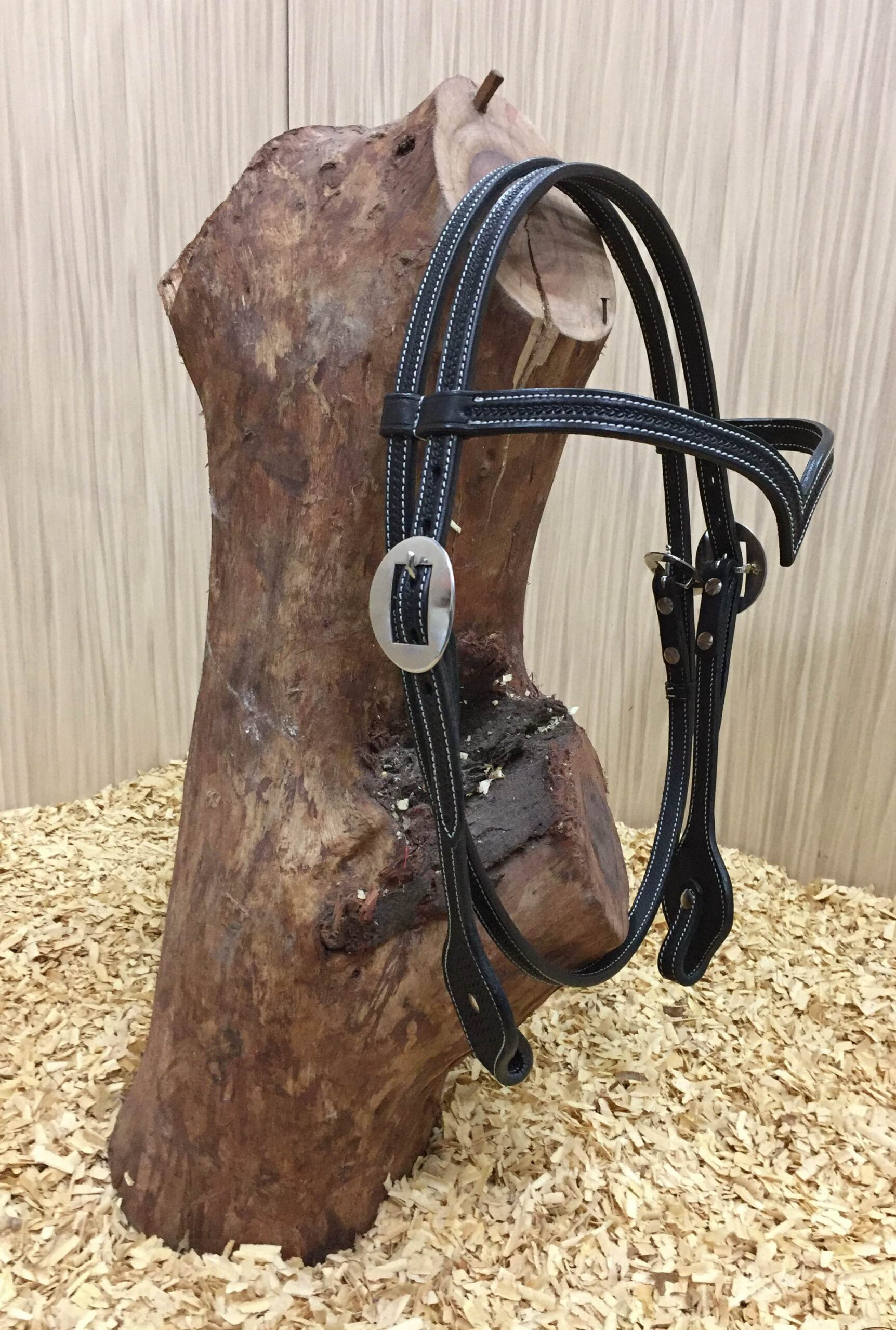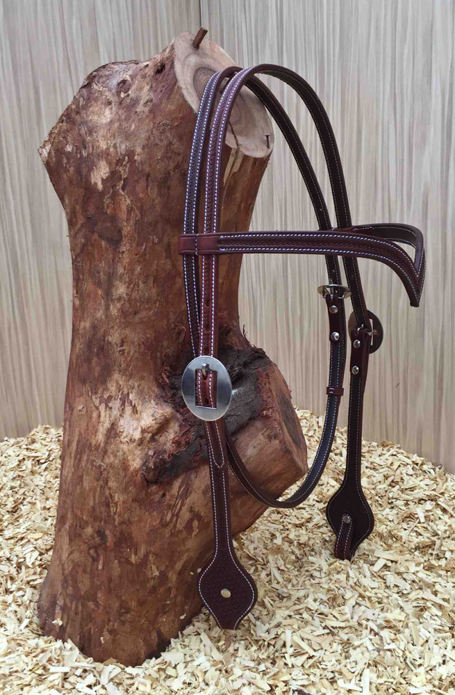 Kožená uzdečka s čelenkou do V zdobená jemným basketem, kování nerez. Podšitá jemnou telecí kůží, ozdobné prošití po obvodu.