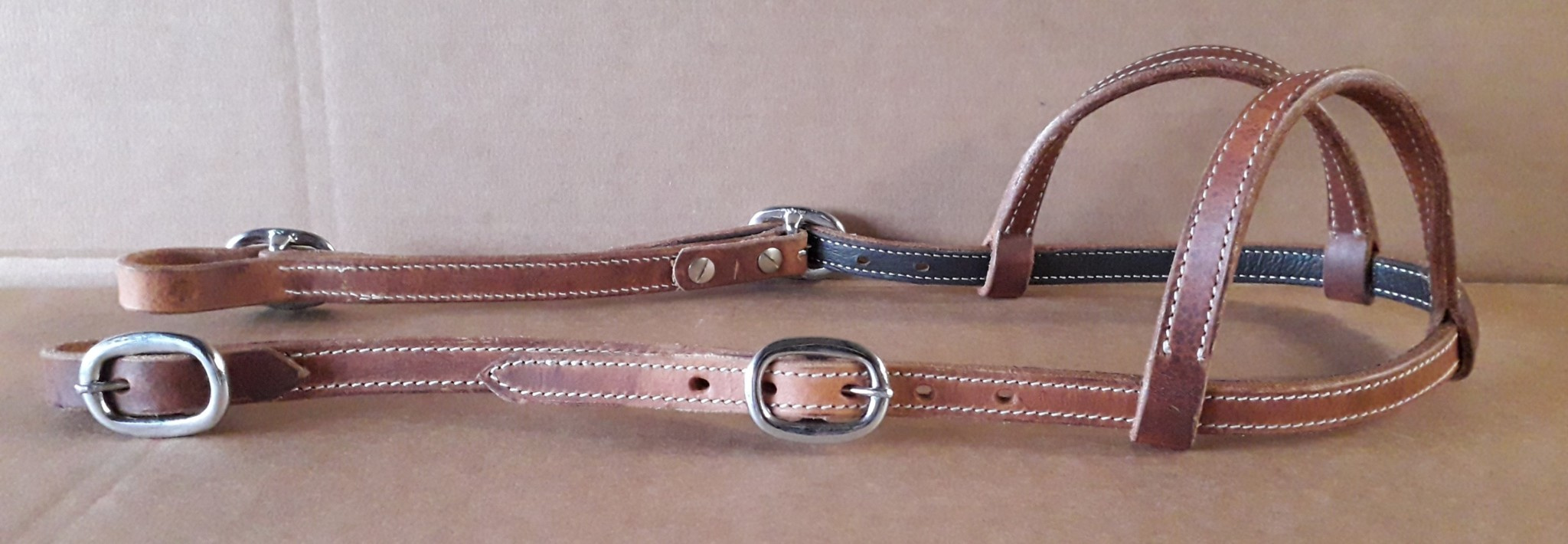Kožená uzdečka na dvě uši. Podšitá jemnou telecí kůží, ozdobné prošití po obvodu.