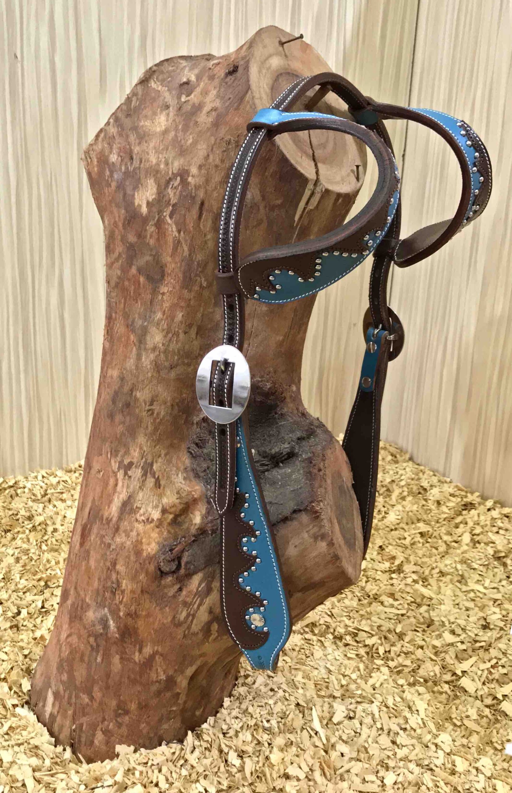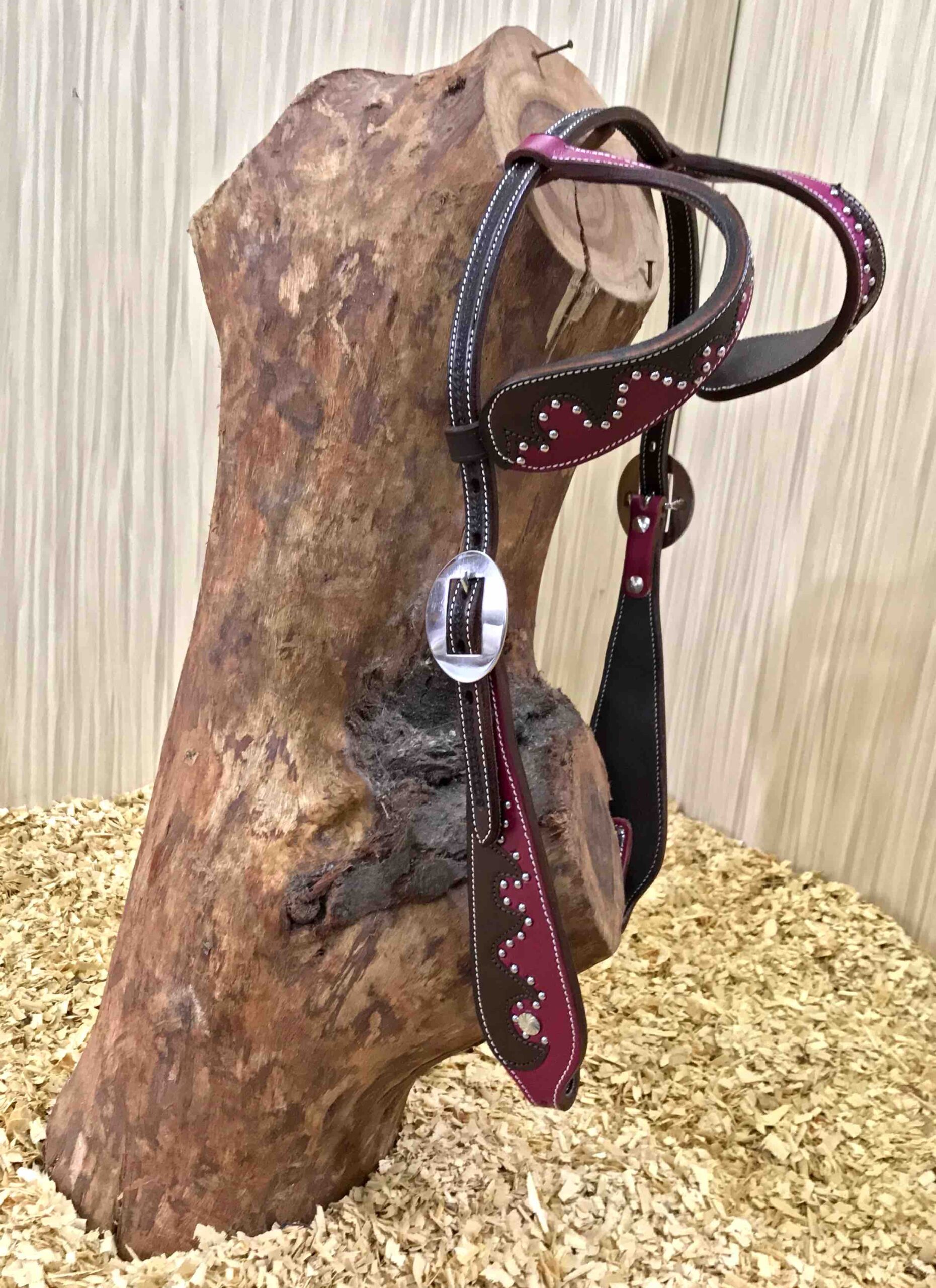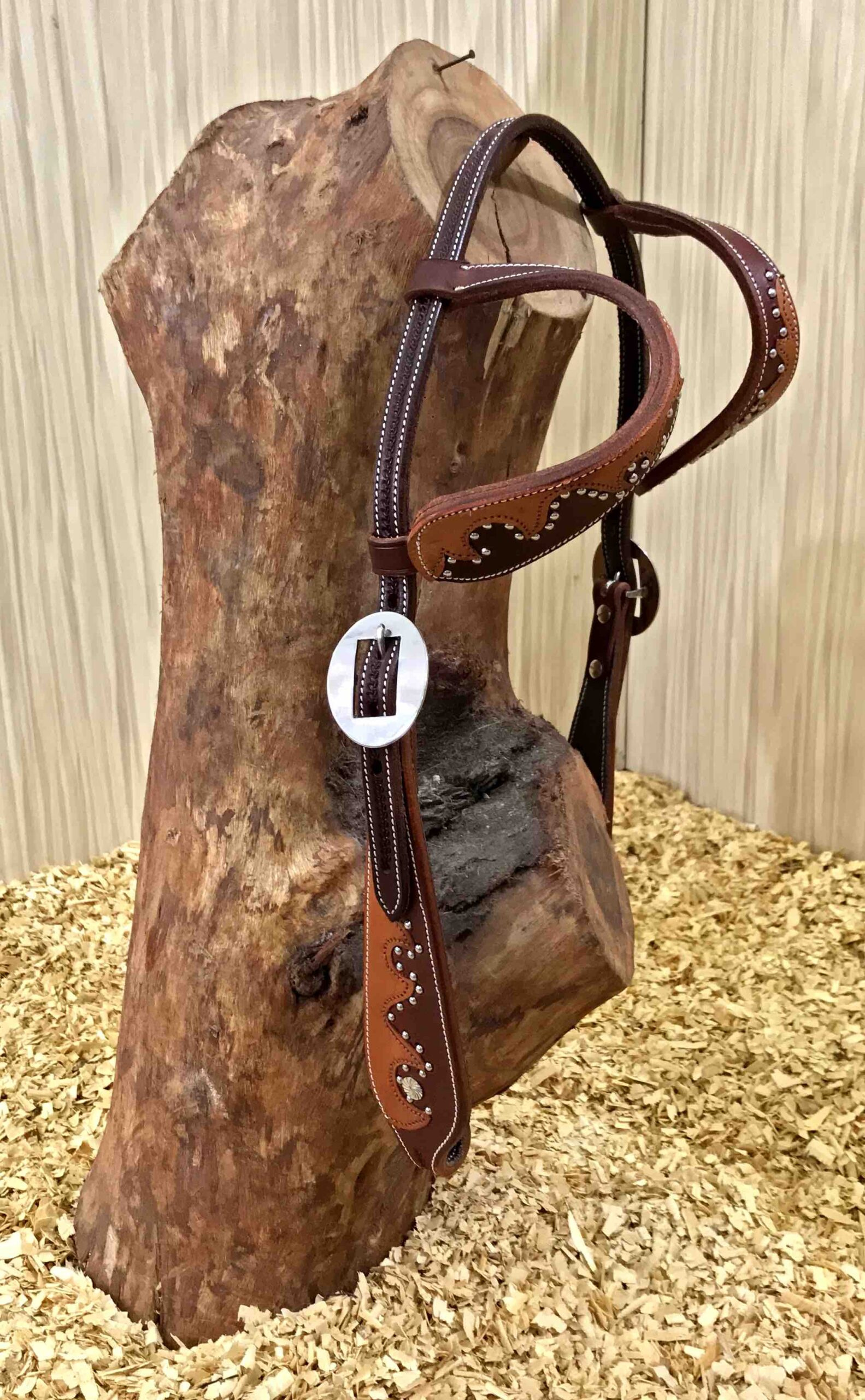 Kožená dvoubarevná uzdečka na dvě uši zdobená stříbrnými nýtky. Podšitá jemnou telecí kůží, ozdobné prošití po obvodu.